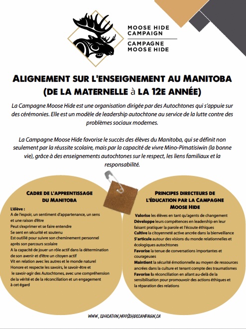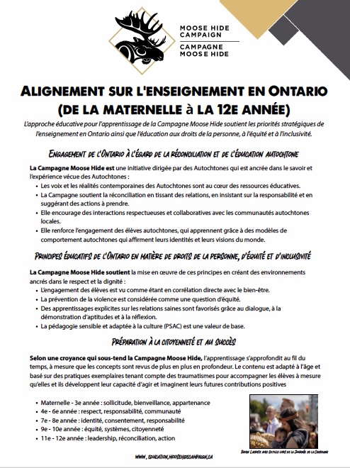 Nos aperçus de guide pour le Manitoba et l’Ontario expliquent comment les ressources de la Campagne Moose Hide soutiennent directement les résultats d’apprentissage provinciaux dans les salles de classe ainsi que les engagements des écoles à l’égard du bien-être, des relations saines et de la réconciliation.
